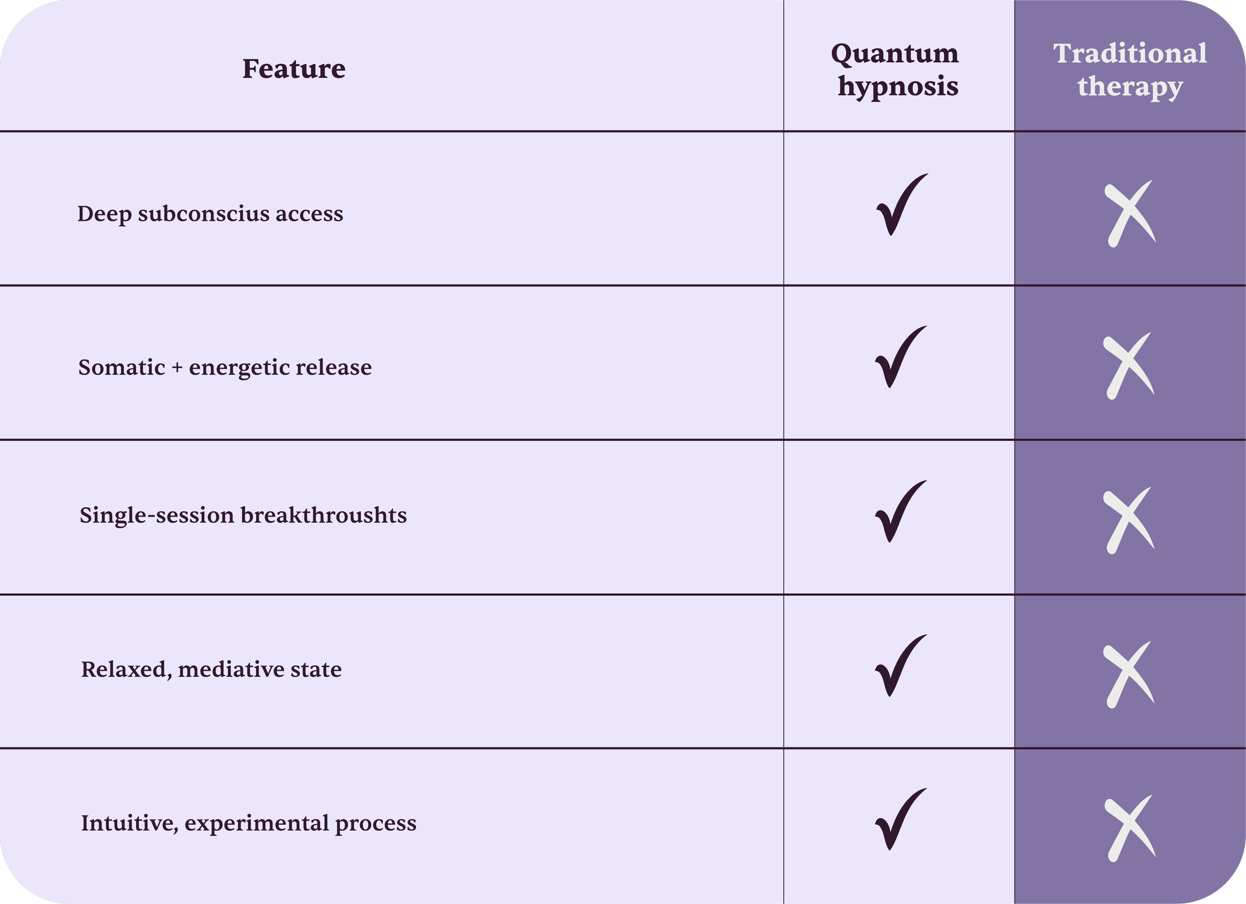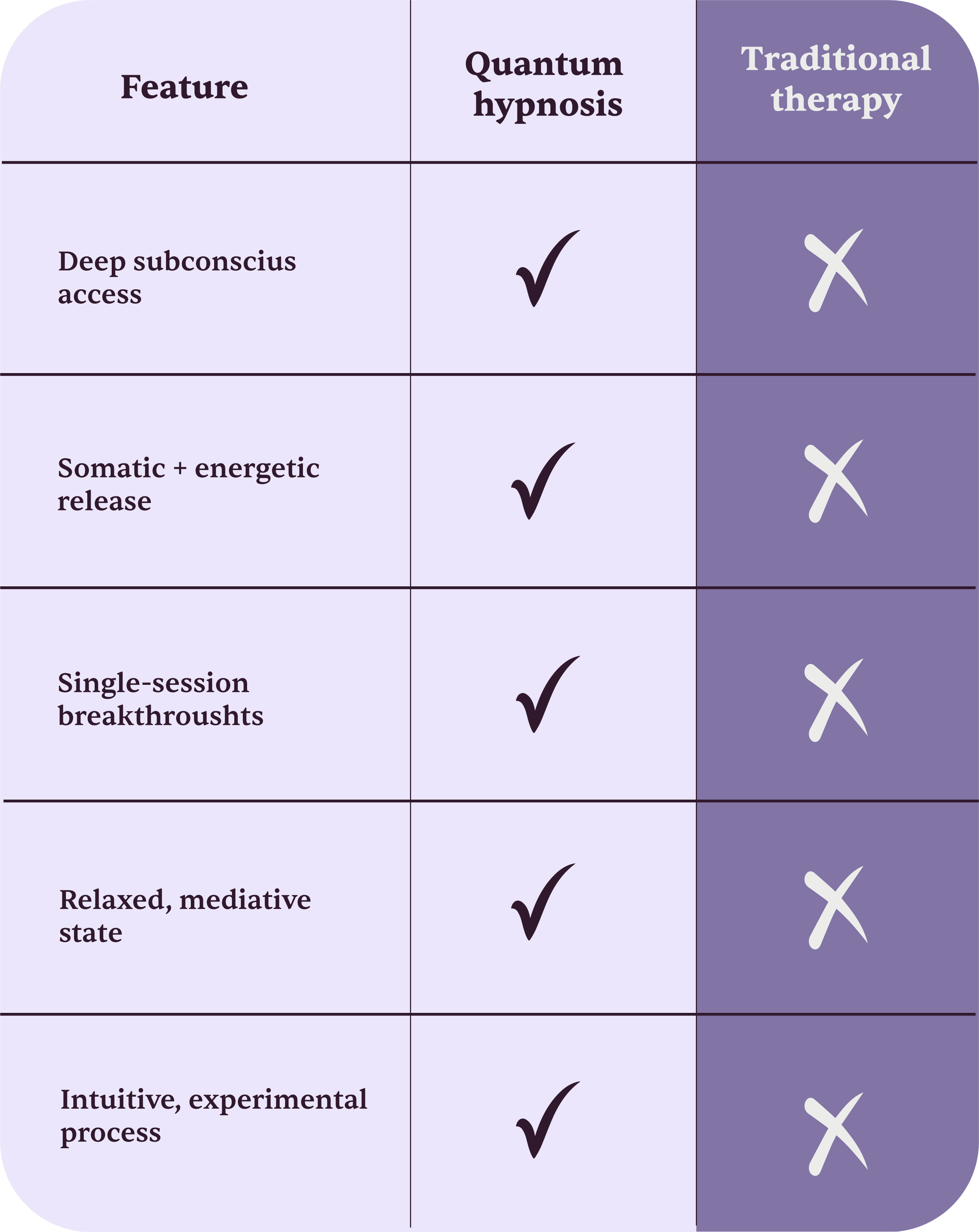 This free 20–30 minute call gives you a first taste of Quantum Hypnosis. After a brief grounding meditation, we move into a gentle intuitive exploration so you can experience the calm and safety of your subconscious space.